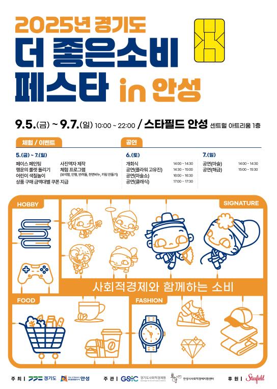 안성시가 오는 9월 5일부터 9월 7일까지 3일간 오전 10시부터 오후 10시까지 스타필드 안성 센트럴 아트리움 1층에서 ‘2025 안성시 더 좋은소비 페스타’를 개최한다.