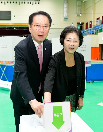 송인헌 충북 괴산군수와 배우자 김영인씨가 21대 대선 사전투표일 첫날인 29일 오전 9시 괴산문화체육센터에 설치된 괴산읍사전투표소를 방문, 선거업무 종사자들을 격려한 후 투표하고 있다.