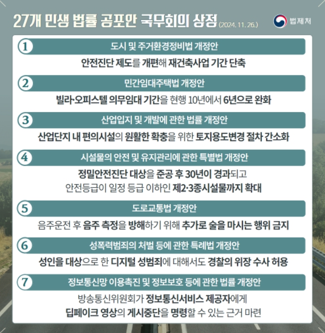 법제처는 11월 14일 국회를 통과한 27개의 법률공포안이 11월 26일 국무회의에 상정됐다고 밝혔다.