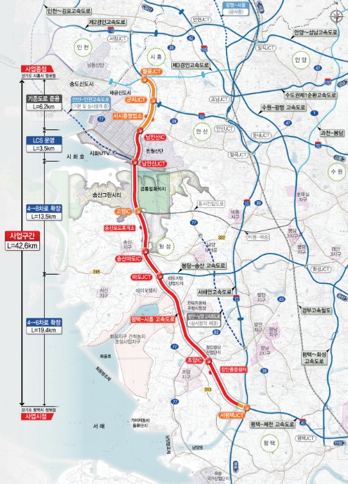 이 사업은 현재 운영 중인 평택-시흥 고속도로 총 연장 42.6km(서평택JCT~월곶JCT) 중 36.4km 구간(서평택JCT~남안산IC)을 기존 왕복 4차로에서 왕복 6~8차로로 확장하는 사업으로, 산업 물류 네트워크의 중추적 역할을 하는 평택-시흥 고속도로의 용량 확충을 통해 수도권 서남부 지역의 교통혼잡을 해소하고, 송산그린시티 등 장래 교통수요와 인천항, 평택·당진항의 산업물동량 증가에 대응하기 위해 추진한다.