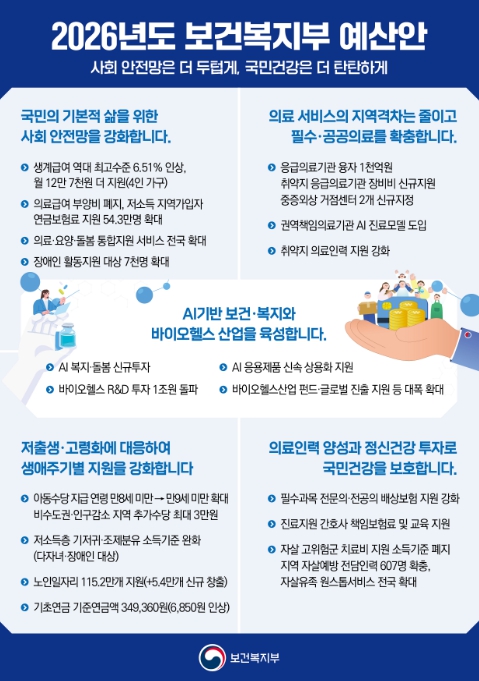 2026년도 보건복지부 예산안은 기본적 삶을 위한 안전망 강화, 저출산‧고령화 인구구조 변화 대응, 지역‧필수‧공공의료 확충, 의료인력 양성과 정신건강 투자 확대, 인공지능(AI)기반 복지‧의료 및 바이오헬스 산업 육성 등 5대 핵심 투자를 중심으로 편성했다.