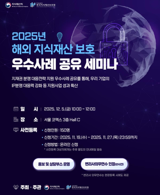지식재산처는 12월 5일 10시 코엑스(서울시 강남구)에서 ‘2025년 해외 지식재산 보호 우수사례 공유 세미나’를 개최한다. 이번 행사는 2025 대한민국 지식재산대전의 일부 행사로 진행되며, 우리 기업이 해외 시장에서 자주 마주하는 지식재산 분쟁에 효과적으로 대응할 수 있게 실제 우수 사례와 대응 전략을 공유하는 자리로 마련됐다.