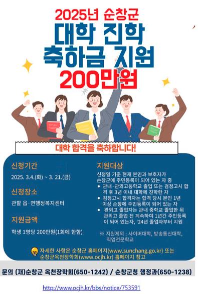 진학 축하금을 받고자 하는 학생은 이번 달 21일까지 주소지 행정복지센터를 방문해 신청할 수 있으며, 구체적인 신청 요건과 필요 서류 등 자세한 사항은 순창군청 공식 웹사이트나 순창군옥천장학회 홈페이지에서 확인할 수 있다.