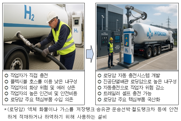 그간 액화수소 산업은 플랜트, 생산, 모빌리티 분야 중심으로 개발이 이뤄져 왔으나, 액화수소 이·충전용 로딩암과 같은 핵심 기자재 국산화는 미흡한 상황이었다. 특히 극저온(-253℃) 환경에서 발생할 수 있는 수소가스 누출이나 화재 등 안전사고 위험을 최소화하기 위해서는, 안전성과 효율성을 동시에 확보할 수 있는 안전장치의 개발이 절실히 요구되어 왔다.