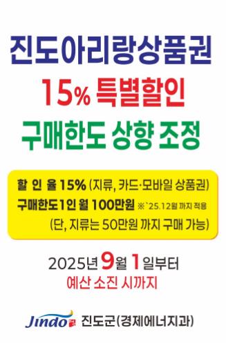 진도군은 추석 명절을 맞아 지역경제를 활성화하기 위해 9월 1일부터 진도아리랑상품권을 15% 특별 할인 판매하고, 12월까지 구매 한도를 상향 조정한다고 밝혔다.