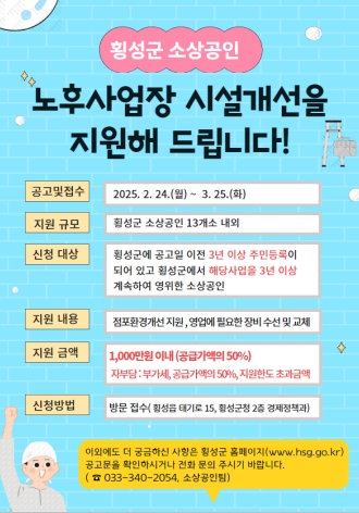 횡성군은 최근 경기침체로 어려움을 겪고 있는 지역 소상공인들의 경영 안정과 지역경제 활성화를 위해 2025년 소상공인 시설개선 지원사업을 추진한다고 밝혔다.