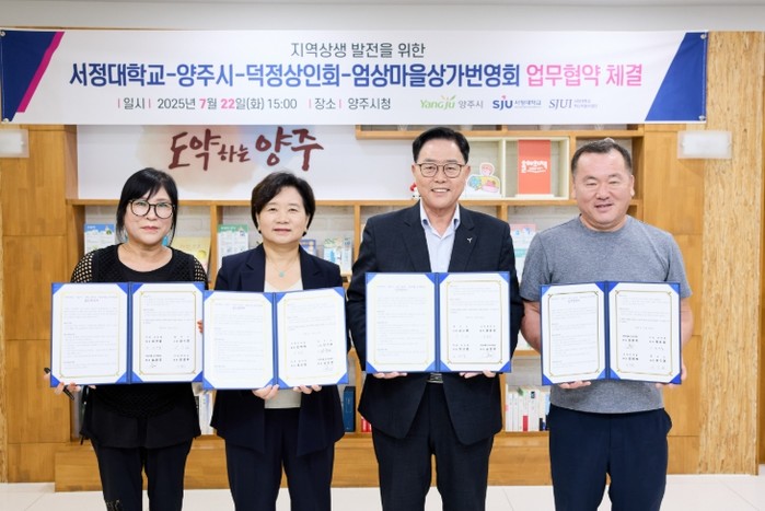 양주시가 지난 22일, 관내 대학인 서정대학교와 지역 골목상권인 덕정상인회, 엄상마을상가번영회 간 지역경제 활성화를 위한 업무협약을 체결했다고 밝혔다.