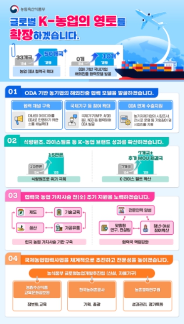 농식품부는 식량원조와 케이(K)-라이스벨트 등 국제사회에서 긍정적인 평가를 받고 있는 대표 사업들을 고도화함으로써 케이(K)-농업 브랜드로 자리매김하고 모범사례를 확산해 나갈 계획이다. 쌀 식량원조 사업은 지원 국가와 물량을 확대하고 지원 품목도 다양화한다. 아프리카 동서부 중심의 케이(K)-라이스벨트 사업은 남부로 확대하고 쌀 전후방 산업, 농촌 생활환경개선, 교육·복지 향상 등을 통합적으로 지원할 계획이다.