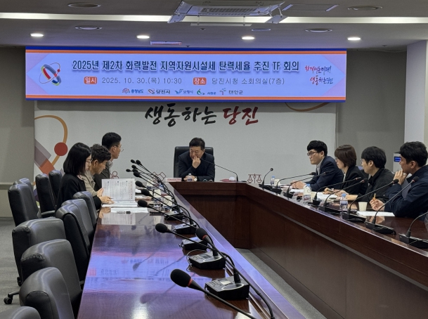 당진시는 10월 30일 당진시청 소회의실에서 화력발전 지역자원시설세의 탄력세율 적용 확대를 위해 ‘화력발전 지역자원시설세 탄력세율 T/F회의’를 진행했다고 밝혔다.