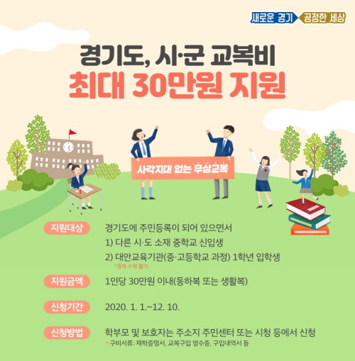 지난해 광역지방자치단체 중 최초로 중학교 교육과정에 준하는 대안교육기관 신입생과 타 시도 소재 중학교 신입생에게 교복비를 지원한 경기도는 2년차를 맞아 대상을 확대하기로 했다.