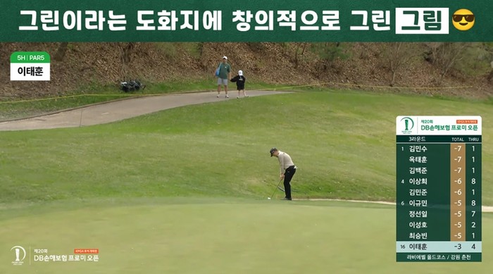 영상 상황은 이렇다. 5번홀(파5)에서 세컨샷을 그린 주변 러프까지 보낸 이태훈(35.캐나다)은 약 41.6야드 남겨둔 상황에서 3번째 샷을 했고 공은 그린 끝 경사를 타고 홀 컵 1m 이내에 붙이는데 성공했다.