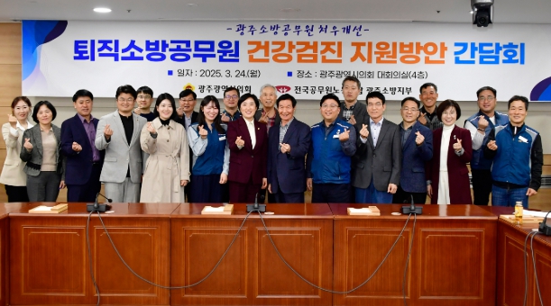 광주광역시의회 신수정 의장은 지난 24일 광주광역시의회 대회의실에서 공무원노조 광주소방지부와 퇴직소방공무원 소방동우회 등과 함께 소방공무원 처우개선을 위한 소통간담회를 가졌다.