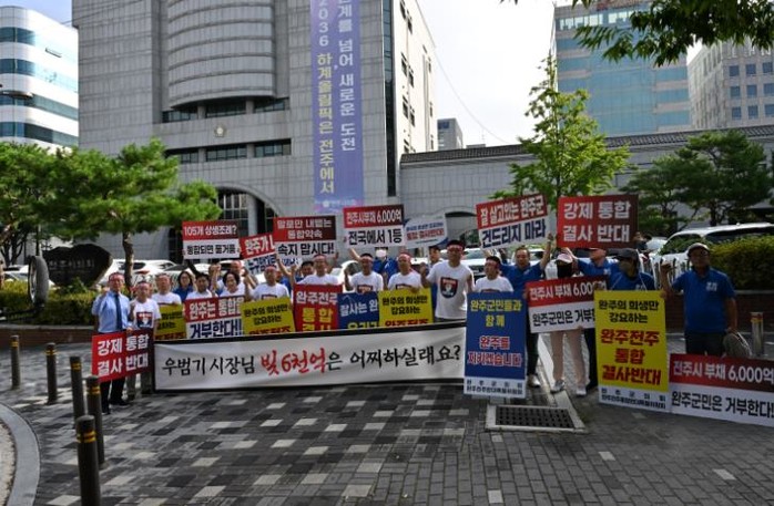 전주시청 앞에서 통합 반대 의지 표명… “군민 71% 이상이 반대”