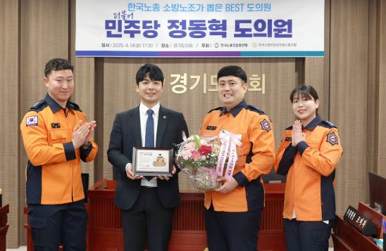 경기도의회 정동혁 의원(더불어민주당, 고양3)이 지난 14일 한국노총 전국소방안전공무원노동조합경기도의용소방대로부터 감사패를 각각 수여받으며, 소방안전 분야에서의 헌신과 노력을 인정받았다.