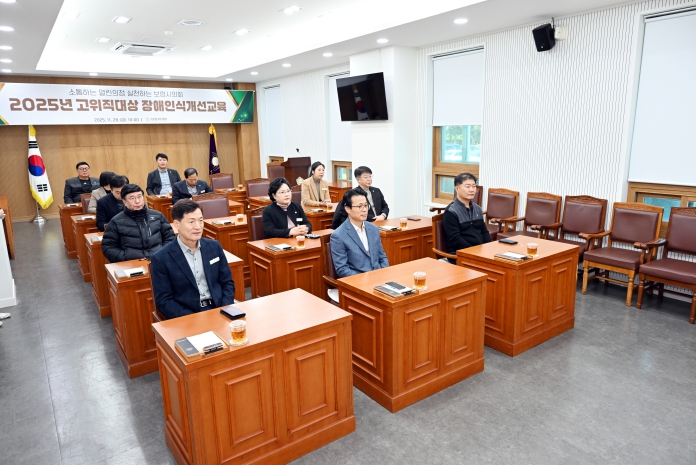 보령시의회는 28일 의회 1층 회의실에서 의원과 사무국장, 수석전문위원 등 고위직 15명을 대상으로 ‘2025년 고위직 장애인식개선교육’을 실시했다.