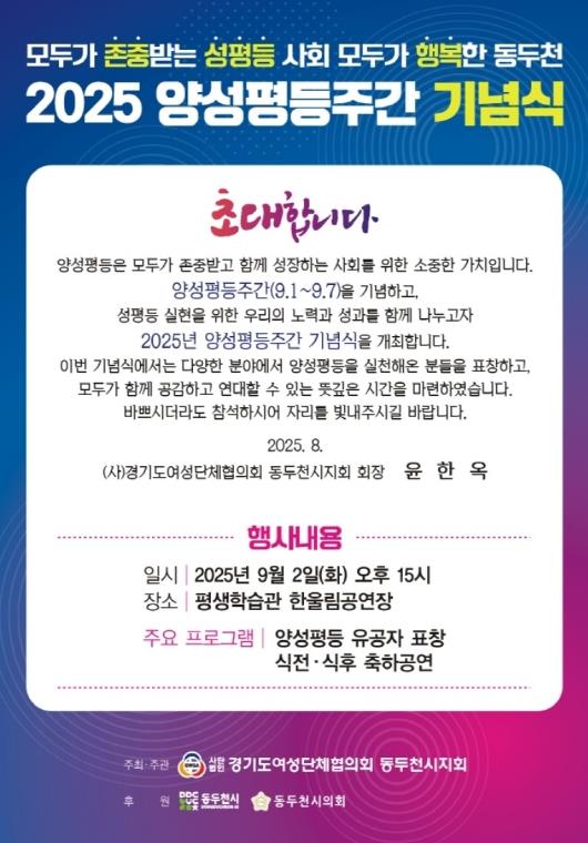 동두천시는 양성평등주간(9월 1일~7일)을 맞아 오는 9월 2일 오후 3시 평생학습관 한울림공연장에서 2025년 양성평등주간 기념식을 개최한다고 밝혔다.