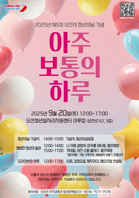 오산시는 법정기념일인 청년의 날을 맞아 오는 9월 20일 오산청년일자리지원센터 이루잡(운천로 62, 3층)에서 2025년 제5회 오산시 청년의 날 기념행사 ‘아주 보통의 하루’를 개최한다고 밝혔다.