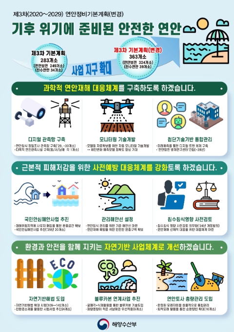해양수산부는 2020년도에 수립된 ‘제3차 연안정비기본계획’의 타당성을 검토하고 연안재해 대응 역량을 강화하기 위해 ‘제3차(2020~2029) 연안정비기본계획(변경)’을 수립하여 고시한다고 밝혔다.