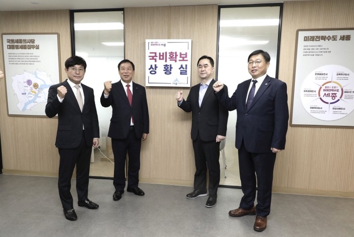 이에 맞춰 최민호 시장은 지역구 김종민 국회의원, 강준현 의원실 관계자와 함께 이날 세종시국회건립지원협력사무소 내에서 국비확보 상황실의 현판식을 개최한 후 곧바로 국비확보 간담회를 가졌다.