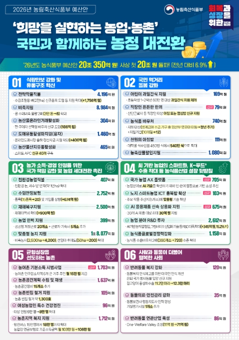 농림축산식품부는 2026년 예산안을 전년 대비 6.9%(1조 2,934억원) 증가한 20조 350억원 규모로 편성했다고 밝혔다.