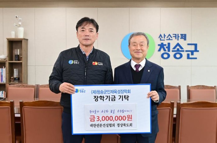 (재)청송군인재육성장학회는 지난 17일 대한전문건설협회 경상북도회가 2022년에 이어 두 번째로 장학금 300만 원을 기탁했다고 밝혔다.