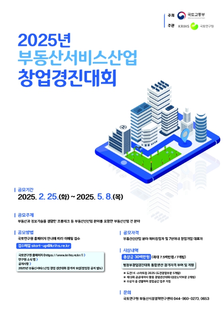 국토교통부는 부동산과 프롭테크(Prop Tech) 분야 최신 정보기술을 결합한 부동산서비스산업 분야 새싹기업을 지원하기 위해 '2025 부동산서비스산업 창업경진대회'의 참가자를 2월 25일부터 모집한다고 밝혔다.