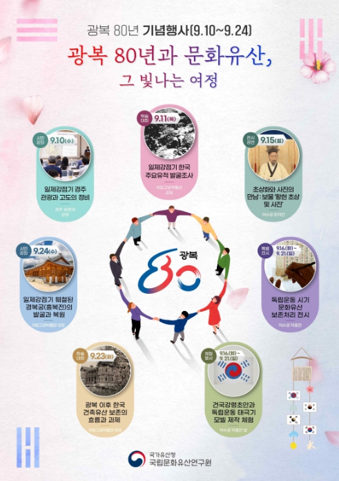 국가유산청 국립문화유산연구원은 광복 80주년을 맞아, 우리 문화유산을 소재로 한 다양한 행사를 통해 국민과 함께 광복의 의미를 새롭게 조명할 수 있기를 기대하며, 앞으로도 문화유산의 연구과 보존을 통해 우리 역사를 바로 세우고 지켜나가는 데 지속적으로 노력해 나갈 예정이다.