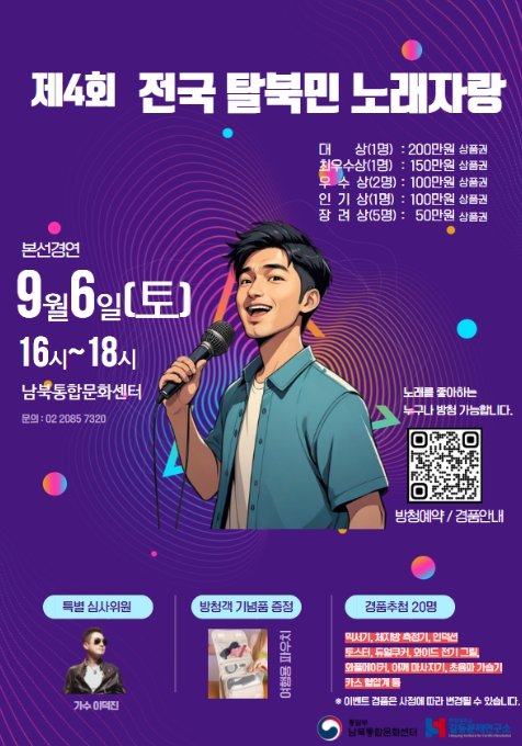 통일부 남북통합문화센터(서울시 강서구 소재)는 9월 6일 오후 4시, '전국 탈북민 노래자랑'을 개최한다.