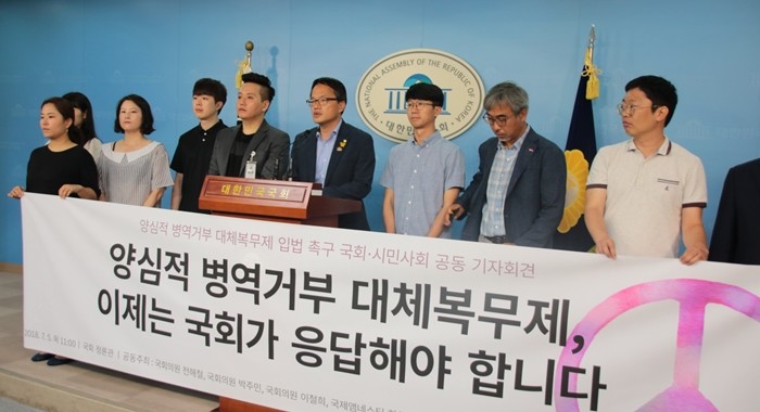 ▲지난 7월 국회 정론관에서 시만단체들이 양심적 병역거부자에 대한 대체복무제 입법을 촉구하는 기자회견을 하는 모습. <사진=인터넷 커뮤니티 갈무리> |