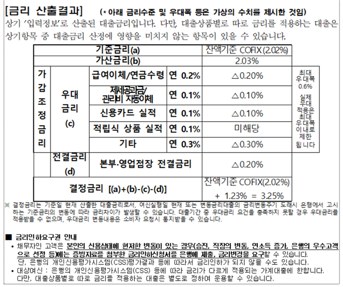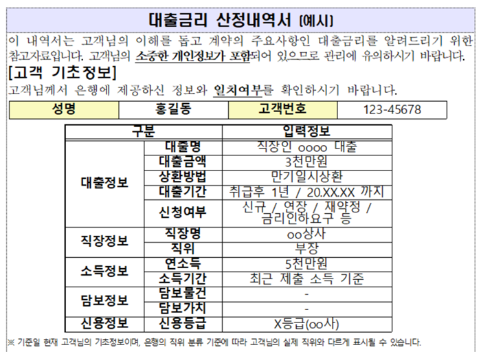 대출자는 산정내역서를 통해 자신의 소득, 담보, 직장·직위, 신용등급 등 금리 산정에 필요한 기초 정보들이 제대로 반영됐는지를 확인할 수 있다.