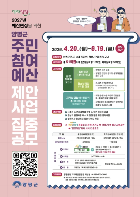 양평군은 오는 6월 19일까지 2027년 예산에 반영할 ‘주민참여예산 제안사업’을 집중 공모한다고 밝혔다.