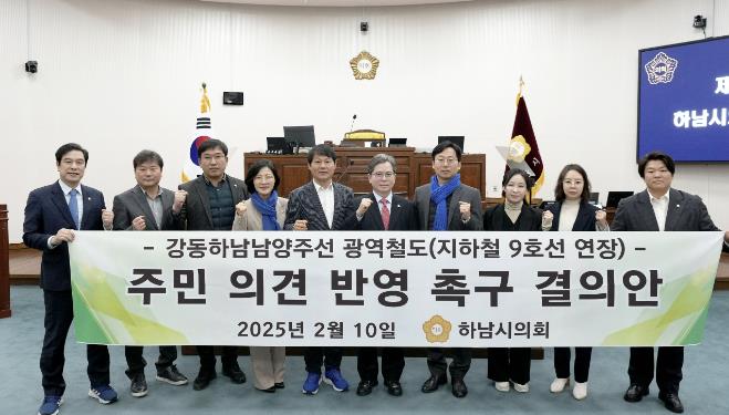 | ▲ 하남시의회는 2월 10일 제337회 제1차 본회의에서 ‘강동하남남양주선 광역철도(지하철 9호선 연장) 주민 의견 반영 촉구 결의안’을 채택했다. (사진_하남시의회 제공) |