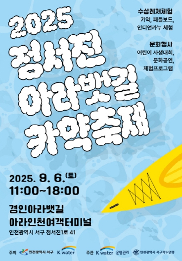인천 서구는 오는 9월 6일 토요일 11시부터 18시까지 아라인천여객터미널 일원에서 남녀노소 안전하게 즐기는 수상레저 축제인 '2025 정서진 아라뱃길 카약축제'를 한국수자원공사 아라뱃길지사(K-water)와 공동으로 개최한다고 19일 밝혔다.