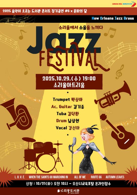 경기도 오산시는 오는 10월 29일 오후 7시, 소리울도서관 3층 소리울아트리움에서 '2025 음악이 흐르는 도서관 콘서트 정기공연 #6 × 문화의 달 – Jazz Festival; 소리울에서 소울을 느끼다'를 개최한다고 밝혔다.