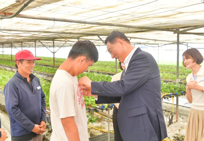 ▲ 7월 김한종 장성군수가 외국인 계절근로자에게 한글 이름 명찰을 달아주고 있다. |