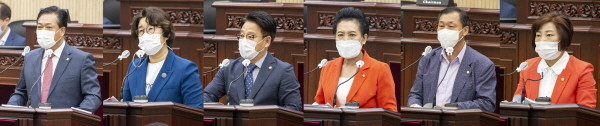 왼쪽부터 김정택 나정숙 윤석진 이진분 박태순 현옥순 의원이 이날 시정질문에 임하고 있는 모습.