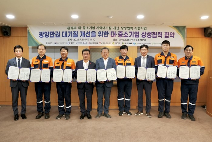 광양시와 영산강유역환경청은 9월 30일 국내 최대 철강업체인 ㈜포스코 광양제철소와 협력업체 4개사가 광양만권 지역 대기질 개선을 위해 ‘광양만권 대․중․소기업 지역 대기질 개선 상생협력 협약’을 체결했다고 밝혔다.
