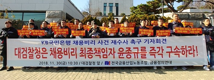 허권 금융노조위원장은 "이미 윤종규 회장이 채용비리에 연루된 정확한 증거가 재판에서도 드러났다"며 "문무일 검찰청장이 채용비리를 근절하고 향후 국민에게 사과하지 않으려면 재수사를 해야 할 것"이라고 말했다.