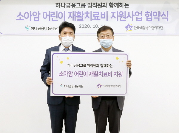 하나금융나눔재단(이사장 함영주)은 16일 서울 성북구 나음소아암센터에서 한국백혈병어린이재단(이사장 오연천)과 「소아암 어린이 재활치료비」지원을 위한 협약을 체결했다고 밝혔다.