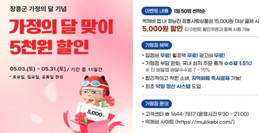장흥군이 5월 가정의 달을 맞아 지역사랑상품권 활용을 통한 지역경제 활성화를 위해 공공배달앱 먹깨비 장흥군 주말 할인 이벤트를 실시한다.