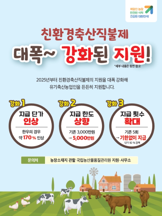 친환경축산직불금 지급단가 인상, 지급한도 상향 및 유기지속직불 신규 도입