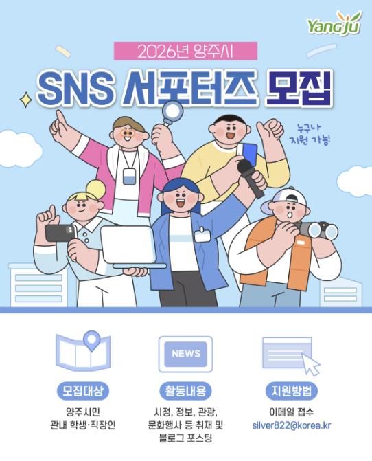 양주시가 시민과 소통하며 시정 소식과 지역의 숨은 매력을 널리 알릴 '2026년 양주시 SNS 서포터즈'를 오는 12월 1일부터 10일까지 10일간 모집한다.