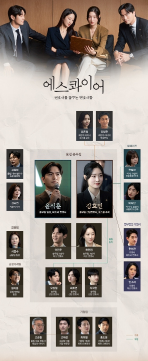 송무팀이라는 이름 아래 뭉칠 윤석훈, 강효민, 이진우(이학주 분), 허민정(전혜빈 분)이 보여줄 팀플레이에 관심이 쏠리는 가운데 이들이 출근할 법무법인 율림의 구성원을 한눈에 파악할 수 있는 인물관계도가 베일을 벗으며 호기심을 더욱 끌어올리고 있다.