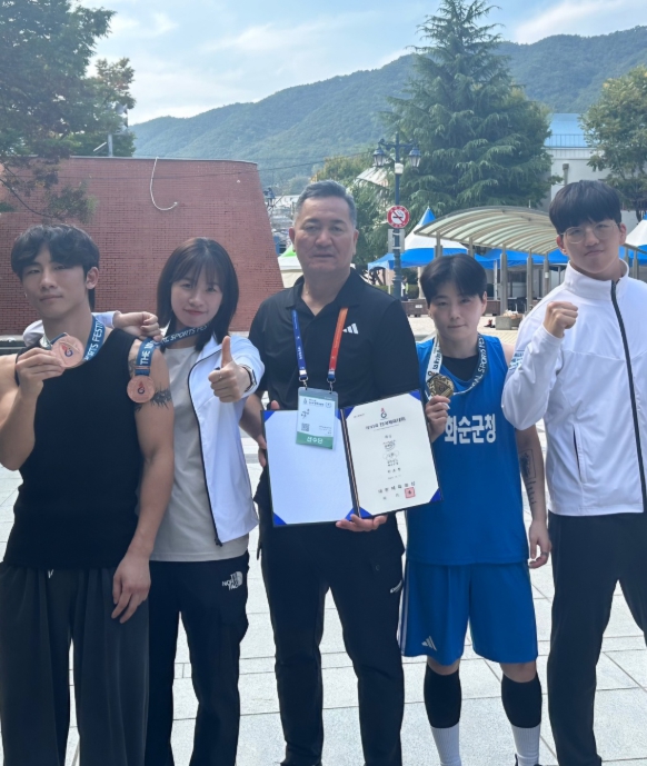 | ▲ 화순군청 복싱부 2024년 제105회 전국체육대회 수상(왼쪽부터 서동근 선수, 임애지 선수, 박구 감독, 박초롱 선수, 선현욱 선수) |