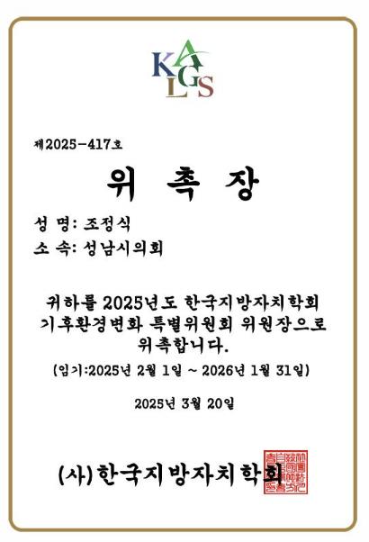 성남시의회 조정식 의원이 (사)한국지방자치학회의 2025년도 기후환경변화 특별위원회 위원장으로 위촉됐다. 임기는 2025년 2월 1일부터 2026년 1월 31일까지다.
