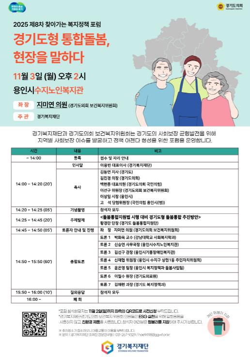 이번 포럼은 경기도의회와 경기복지재단이 공동 주최하고, 경기복지재단이 주관하는 ‘2025 찾아가는 복지정책 포럼’의 일환으로, 2026년 3월 시행을 앞둔 '의료·요양 등 지역 돌봄의 통합지원에 관한 법률'에 대응하기 위한 '경기도형 통합돌봄 모델’의 발전 방향을 모색하기 위해 마련됐다.