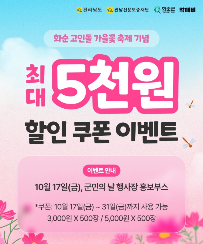 화순군은 오는 10월 17일 제44회 화순군민의 날 행사장에서 2025 화순 고인돌 가을꽃 축제 기념 공공배달앱 ‘먹깨비’ 이벤트를 진행한다고 밝혔다.