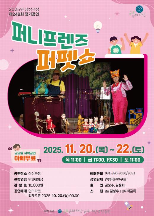 군포문화재단 군포시평생학습원 상상극장은 오는 11월 20일부터 22일까지 정기공연으로 인형극 ‘퍼니프렌즈 퍼펫쇼’를 무대에 올린다.
