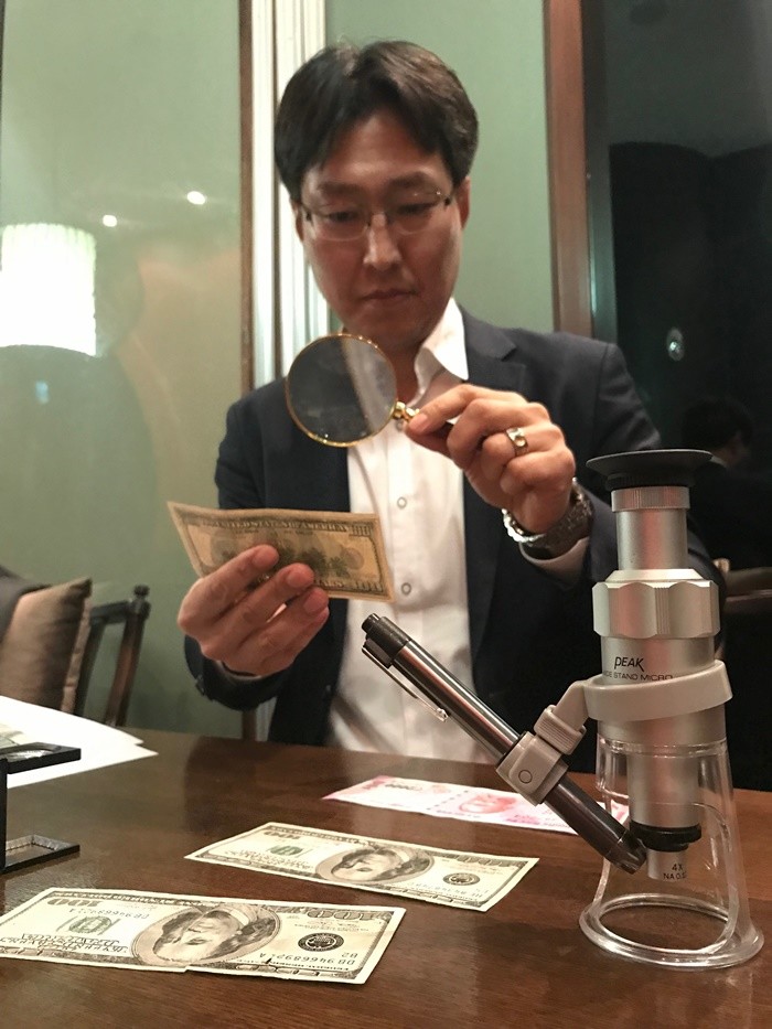 | ▲ 은행 위폐전문가가 신종 위조지폐를 확대경을 통해 분석하고 있는 모습. <사진=은행연합회 제공> |