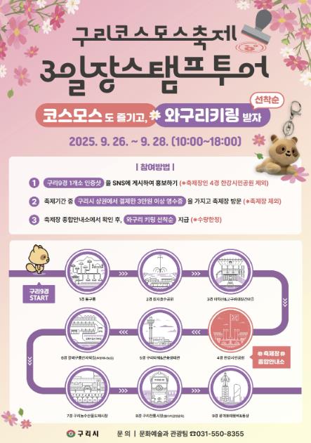구리시는 오는 9월 26일부터 28일까지 구리한강공원에서 열리는 '코스모스 축제' 기간 동안 ‘3일장 스탬프 투어’ 행사를 진행한다.